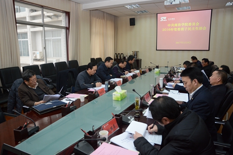 為開好2016年民主生活會,學校黨委高度重視,精心安排。一是召開了黨委中心組擴大會議,專題學習討論了十八屆六中全會和全國高校思想政治工作會議精神,深入開展“兩學一做” 學習教育。二是制定了《黨委班子2016年度民主生活會方案》,明確了開好民主生活會各環節的工作任務和要求。三是召開了二級教學單位代表、職能部門代表及博士代表三個座談會廣泛征集對黨委班子及班子成員的意見和建議,列出了問題清單。四是班子成員進行了深入的談心談話,黨委班子和班子成員按照民主生活會方案要求,撰寫了班子對照檢查材料和個人發言提綱,為開好民主生活會做了充分準備。