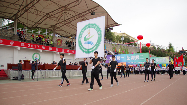 追逐四月的和風,沐浴初夏的陽光,4月20日上午,我校2017年田徑運動會正式開幕。校長范新會、紀委書記王思懷、副校長劉勇出席開幕式。由各二級學院和教職工代表組成的10個方隊,以昂揚的姿態、矯健的步伐走過主席臺,展現了我校師生意氣風發、昂揚向上的精神風貌。范新會致開幕詞并宣布運動會開幕。各二級教學單位黨政負責人、各職能部門負責人以及全體學生參加本次運動會。開幕式由劉勇主持。