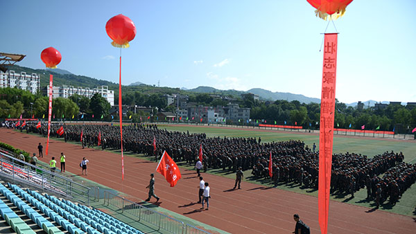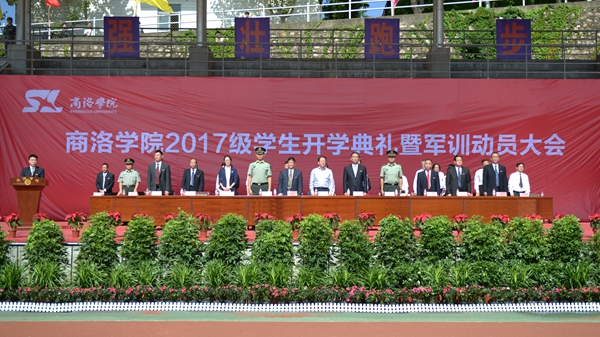 金秋送爽,丹桂飄香。9月6日上午,我校2017級學生開學典禮暨軍訓動員大會在學校體育場隆重舉行。校領導龍治剛、范新會、王思懷、魏書堂、彭虎軍、劉寶盈、劉勇,中國人民解放軍陸軍第77集團軍保障旅政治處副主任趙鑫中校,中國人民解放軍陸軍第77集團軍保障旅二營營長、商洛學院2017級學生軍訓團團長馬防少校,我校2010屆校友、商洛市旭初農林開發有限公司總經理周麗娜出席大會。各學院(部)黨政主要負責人、有關職能部門負責人及3100余名2017級新生參加大會。大會由校黨委副書記彭虎軍主持。