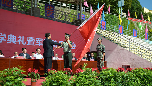 校黨委書記龍治剛為2017級學生軍訓團授予團旗,馬防代表學生軍訓團接旗。
