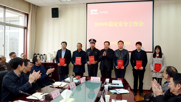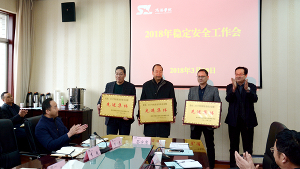 黨委書記龍治剛傳達了全省高校穩定安全工作會議精神,與職能部門及院部負責人代表簽訂了2018年穩定安全工作責任書。紀委書記王思懷傳達了全省高校全面從嚴治黨工作會議精神。副校長魏書堂為先進集體及個人代表頒獎。