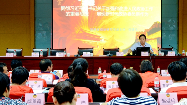 省政協研究室副主任周建功以《貫徹習近平總書記關于加強和改進人民政協工作的重要思想展現新時代政協委員新作為》為題為與會人員作專題輔導報告,他在報告中詳細解讀了習近平總書記關于加強和改進人民政協工作的重要思想,全面回顧了人民政協69年的光輝發展歷程,并就政協章程的修改、政協的十項經常性工作、政協委員履職的基本要求等幾個方面作了深入系統的講解。