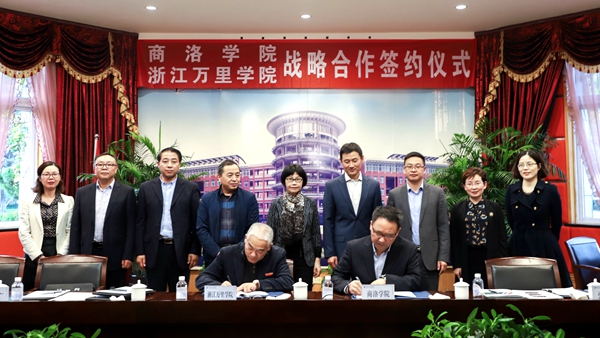 10月24日,校黨委書記龍治剛、副校長劉勇赴浙江萬里學院考察交流,洽談合作事宜,并與浙江萬里學院簽訂戰略合作框架協議。浙江萬里學院校長應敏,副校長錢國英、馬建榮出席簽約儀式。龍治剛和應敏代表兩校在《商洛學院 浙江萬里學院第三輪戰略合作框架協議》上簽字。