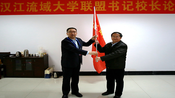 在論壇上,龍治剛向2019年漢江流域聯盟輪值理事長單位湖北汽車工業學院授旗,湖北汽車工業學院校長鐘毓寧接旗。