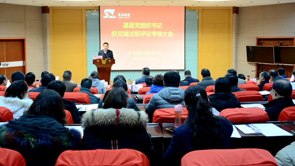 黨委書記龍治剛認真聽取了述職匯報,并現場逐一進行點評。他在充分肯定各黨總支、直屬黨支部書記一年來抓黨建工作取得的成績的同時,針對各黨總支、直屬黨支部的實際情況和具體問題提出了切實可行的意見建議,為各黨總支、直屬黨支部下一步更好地開展黨建工作提供了思路、指明了方向。他在點評中要求,各黨總支、直屬黨支部書記要認真落實《中國共產黨支部工作條例(試行)》,積極推進基層黨組織標準化建設,爭創“五好黨支部”;要重視發揮基層黨組織的戰斗堡壘作用,積極創新工作方式方法,更好地凝聚人心、引領發展;要加強培訓,提高支部成員的政治素質,加強對師生黨員懂規矩、守紀律的引導教育,堅定正確的政治方向,提升師生黨員的道德修養和黨性修養水平;要認真貫徹落實黨的教育方針,發揮黨組織和黨員在美育、體育以及管理育人、服務育人等方面的示范引領作用,培養德智體美勞全面發展的社會主義建設者和接班人;要把黨建和中心工作結合起來,以卓有成效的黨建工作,促進師資隊伍建設、學科專業建設、科學研究、人才培養和服務地方等各項工作,為穩步提升人才培養質量,建設一流應用型本科院校提供有力的政治保障。