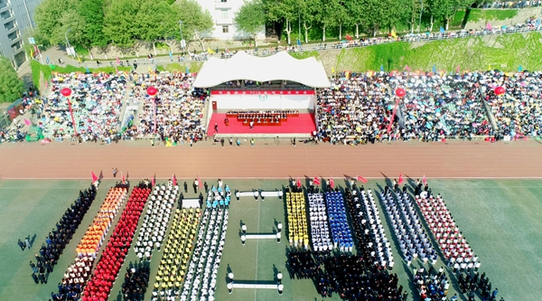 文體表演尾聲,全場師生揮舞著手中小紅旗,共同唱響《我和我的祖國》,齊聲高喊“祖國,我愛你”,把現場氣氛推向高潮。