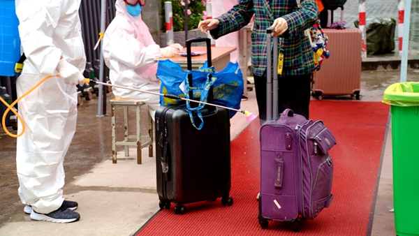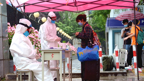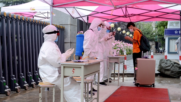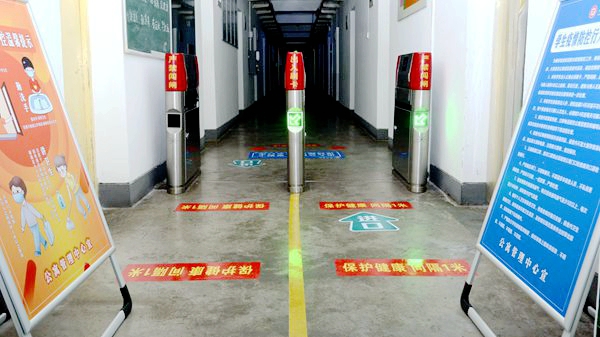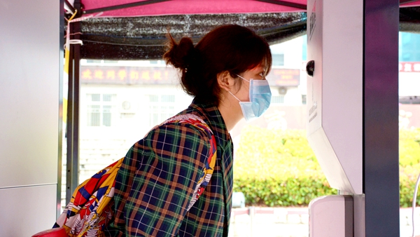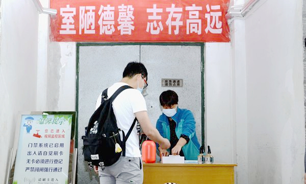 校門口,工作人員引導報到學生有序通過測溫通道、消殺區(qū)、身份核驗區(qū)、掃碼報到區(qū)、院系學生報到處,對學生行李就地進行全面消毒、更換口罩、測量體溫、核驗健康綠碼和身份證明、簽訂返校承諾書,依次完成開學報到各個項目步驟后,學生在輔導員、聯(lián)絡教師的陪同下,保持安全距離,前往各自所在的公寓樓,經(jīng)公寓管理人員測溫、手部消毒、信息登記后,領(lǐng)取出入證進入宿舍。