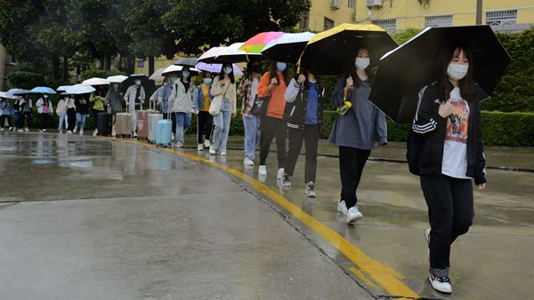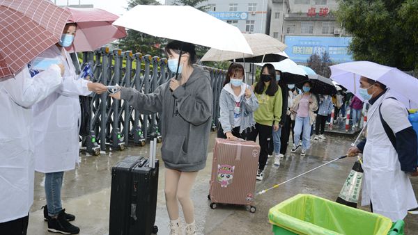 學校高度重視此次演練,制定了詳細的演練方案,模擬設置了學生報到、餐廳就餐、應急情況處理等多個場景,對新生報到流程進行了全景模擬。演練自校門外開始,參演學生佩戴口罩、攜帶行李,以1米以上間隔依次進行更換口罩、測量體溫、信息識別登記、物品消殺等程序后,通過測溫門進入校門,按照報到流程,在新生登記處進行登記。門崗處還設置了臨時留觀點,為體溫異常的報到新生做進一步檢測處理。餐廳實行錯峰、分餐制,演練學生佩戴口罩在餐廳入口處洗手、測溫、消毒后有序進入餐廳,間隔1米以上距離排隊點餐、取餐,保持距離、單向就座,就餐結束后,有序從指定出口排隊離開。