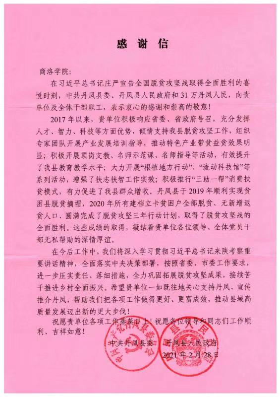 日前,中共丹鳳縣委、丹鳳縣人民政府向我校發來感謝信,代表31萬丹鳳人民對我校在丹鳳縣開展結對幫扶工作、支持幫助丹鳳縣取得脫貧攻堅全面勝利致以誠摯的感謝。