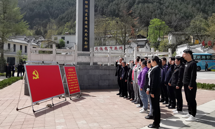 在鄂陜邊蘇維埃政府舊址,全體黨員認真聆聽講解員為大家講述的山陽縣袁家溝口蘇維埃政府、鄂陜邊區蘇維埃政府、鄂陜第四路游擊師成立的歷史及紅二十五軍的革命歷史,參觀了當年蘇維埃政府工作人員會議室、辦公室等革命遺址,重溫了革命先烈在血雨腥風中,為民族解放進行的艱苦卓絕的斗爭歷程,深切感懷革命先輩用鮮血和生命鑄就的革命精神。在鄂陜邊區蘇維埃政府紀念碑前,全體黨員面對鮮紅的黨旗,高舉右手莊嚴宣誓,重溫入黨誓詞。在烈士陵園,全體黨員在烈士墓前駐足三鞠躬并敬獻花籃,深切緬懷英烈們的豐功偉績。