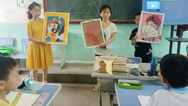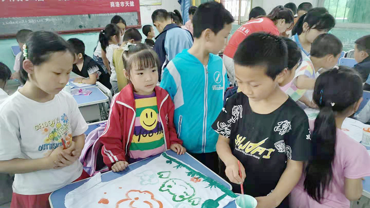 活動中,師生為該校留守兒童贈送了圖畫本、鉛筆、橡皮等繪畫用品。向小朋友們展示了校藝術學院學生制作的泥塑、石頭畫、剪紙拼畫、電腦繪畫等美術作品,拓展了小朋友們的審美視野,增強了大家的邏輯思維與形象思維能力,激發了大家熱愛美、發現美、追求美的熱情。師生還進行了“T恤衫彩繪”現場學創實踐,用美術實踐與T恤衫繪畫相結合的教學方式,鼓勵和引導小朋友們嘗試多樣思維和多元表現,進一步增強了大家的實踐創作能力。在我校師生一對一、手把手的耐心講解與悉心指導下,每個小朋友都獨立完成了精美的美術作品。