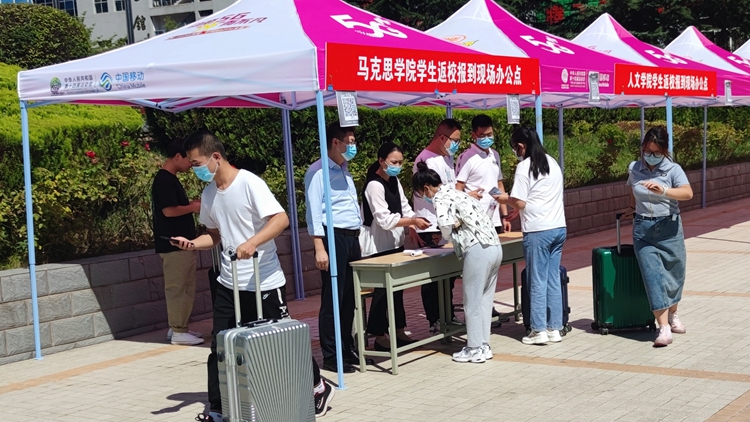 學校高度重視此次演練,制定了詳細的演練方案,模擬設置了學生入校、學生報到、應急情況處理、核酸檢測等多個場景,對學生報到過程中的重點環節和風險點、防控點進行應急實戰演練。演練自校門外開始,參演學生以1米以上間隔依次進行掃描健康碼、身份核驗、查驗48小時內核酸單、出示通信大數據行程卡、更換口罩、測量體溫、消毒等環節后通過測溫門進入校門,在學院接待點進行二次體溫檢測、核驗疫苗接種后統一前往玉蘭廣場進行核酸檢測。門崗處還設置了臨時隔離點,為體溫異常的報到新生做進一步檢測處理。
