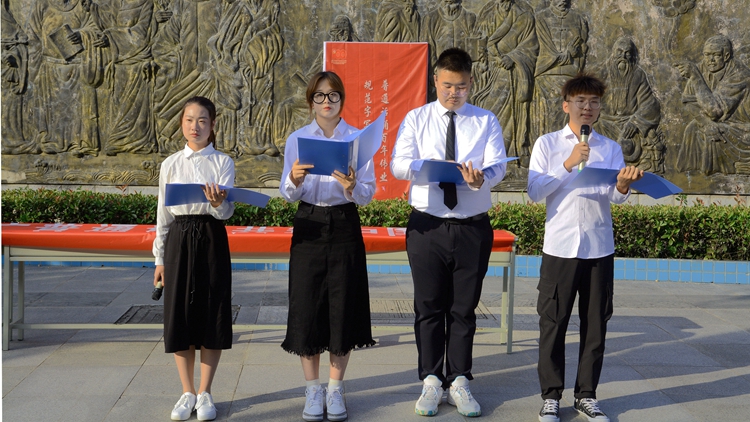 人文學(xué)院學(xué)生代表王瀅在表態(tài)發(fā)言中呼吁全體學(xué)生要規(guī)范使用普通話,讓規(guī)范語言之花開遍美麗的校園。學(xué)生朱怡寧、丁欣玉為大家表演了相聲《普通話》,通過生動有趣的表演向展示了不良語言習(xí)慣及普通話的別樣韻味,切實增強(qiáng)了大家的語言規(guī)范意識。王林等學(xué)生向大家朗誦了紅色詩歌《永遠(yuǎn)跟黨走》,帶領(lǐng)大家重溫了先輩們浴血奮戰(zhàn)的革命歲月,讓大家在詩歌中感悟黨的崢嶸歲月,體會語言的動人魅力。