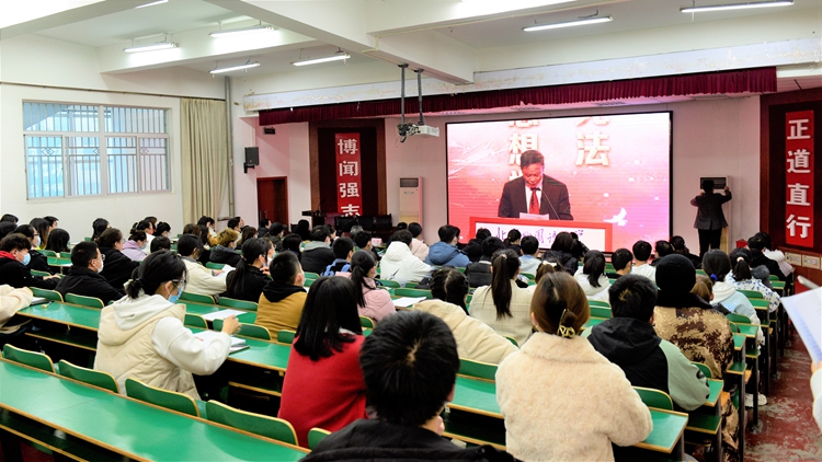 12月4日是“國家憲法日”。我校組織師生收看和同步參與國家憲法日“憲法晨讀”活動,引導(dǎo)師生自覺尊崇憲法、學(xué)習(xí)憲法、遵守憲法、維護(hù)憲法、運(yùn)用憲法。校宣傳部、學(xué)工部、團(tuán)委相關(guān)負(fù)責(zé)人,各二級學(xué)院師生代表共90余人參加活動。
