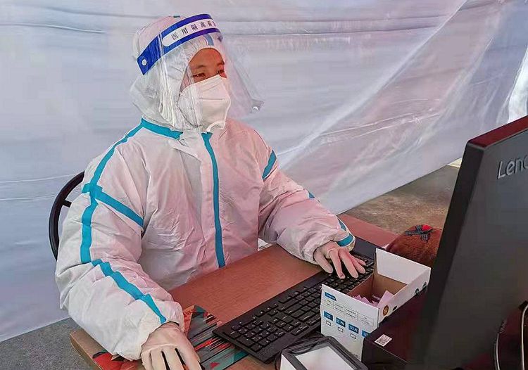 (王丹彤在核酸采樣點(diǎn)開展老幼身份信息輸入工作)