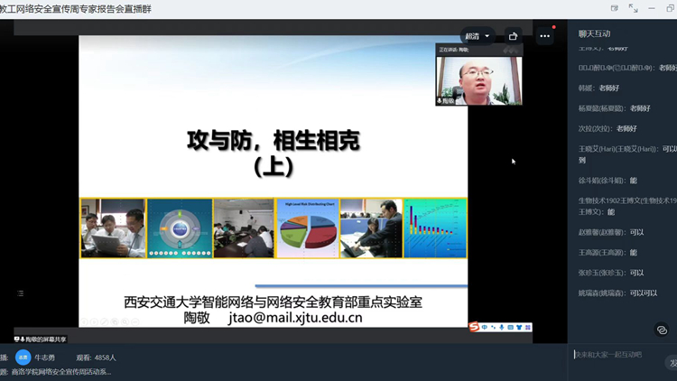 為推動(dòng)第九屆網(wǎng)絡(luò)安全宣傳周活動(dòng)深入開展,提升師生網(wǎng)絡(luò)安全意識(shí)和防護(hù)技能,營(yíng)造網(wǎng)絡(luò)安全人人有責(zé)、網(wǎng)絡(luò)安全人人參與的濃厚氛圍,9月7日下午,我校通過(guò)線上平臺(tái)舉辦網(wǎng)絡(luò)安全知識(shí)專家報(bào)告會(huì)。大會(huì)邀請(qǐng)西安交通大學(xué)網(wǎng)絡(luò)空間安全學(xué)院副院長(zhǎng)、智能網(wǎng)絡(luò)與網(wǎng)絡(luò)安全教育部重點(diǎn)實(shí)驗(yàn)室副主任陶敬老師作了題為《攻與防,相生相克!》的專題報(bào)告。報(bào)告會(huì)由信息化建設(shè)與管理處負(fù)責(zé)人付軍昌主持,各單位網(wǎng)絡(luò)安全和信息化工作負(fù)責(zé)人、網(wǎng)絡(luò)安全和信息化專員,教師代表及2019、2020、2021級(jí)全體學(xué)生5000余人線上參加報(bào)告會(huì)。
