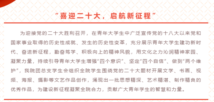 城鄉規劃與建筑工程學院舉辦了“喜迎黨的二十大,啟航新征程”活動,通過展現學生自行創作的黨的二十大題材文學、書畫、視頻、海報、攝影等文藝作品,充分展示了青年大學生奮進新征程、建功新時代,勤奮篤學、積極向上的精神風貌。