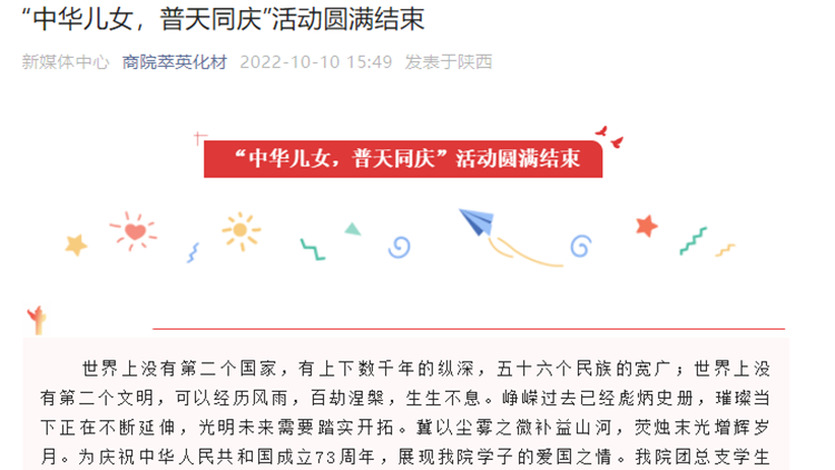 化材學院舉辦了“中華兒女,普天同慶”活動,通過以文章、繪畫方式“憶古昔、看今朝、展未來”,引導廣大師生銘記歷史,踔厲奮發,為祖國的高速發展貢獻自己的一份力量。