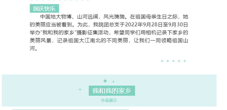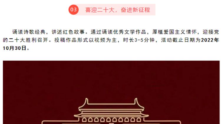 為深入開展“青春獻禮黨的二十大,強國有我新征程”主題宣傳教育活動,熱烈慶祝中華人民共和國成立73周年,引導和激勵廣大師生厚植愛國主義情懷,營造網絡文明新風,國慶節期間,我校組織開展了豐富多彩的“喜迎黨的二十大 歡度國慶節”系列主題活動。廣大師生通過各級各類網絡平臺和線上活動,用自己的方式為祖國送上美好祝福,禮贊新時代奮進征程,以良好的精神面貌和昂揚姿態喜迎黨的二十大勝利召開。