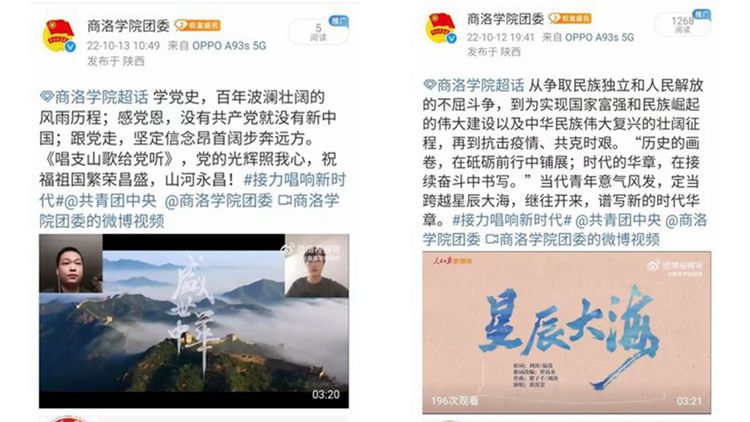 “接力唱響新時代”微博接力活動通過發布歌唱視頻的方式參與微博話題。校團委組織藝術學院優秀學子傾情演唱《星辰大海》《唱支山歌給黨聽》《我愛你,中國》《國家》以及《我的祖國》等紅色歌曲,以此唱響心中理想、唱出青春最強音,以青春的姿態、昂揚的歌聲抒發對黨的誠摯熱愛和深厚情感。