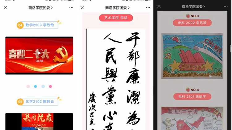 國慶期間,校團委還面向全校師生開展了“喜迎黨的二十大、永遠跟黨走、奮進新征程”主題文藝作品征集評選活動。活動中,師生將愛黨愛國的熱情傾注筆端,融入作品創作中。前后共收集到文學類、美術類、視頻類作品150余件,經初審后評選出39件優秀作品在校團委公眾號展播,先后有9000余人次訪問、7000余人次參與投票,最終評選出24件最佳作品予以表彰。