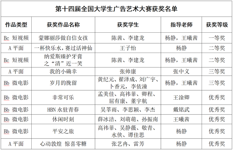 12月15日,第14屆全國大學生廣告藝術大賽(以下簡稱“大廣賽”)全國總評審獲獎名單揭曉,競賽成果展示云盛典在北京成功舉辦。本屆大賽全國共1869所高校踴躍參賽,170萬余名大學生積極提交創意作品。我校學子不負眾望,分別在平面設計、微電影廣告視頻、短視頻等賽道中奮勇拼搏,共計有10項參賽作品榮獲本屆“大廣賽”陜西賽區大獎,其中一等獎1項、二等獎2項、三等獎2項、優秀獎5項,獲獎總數再創新高。