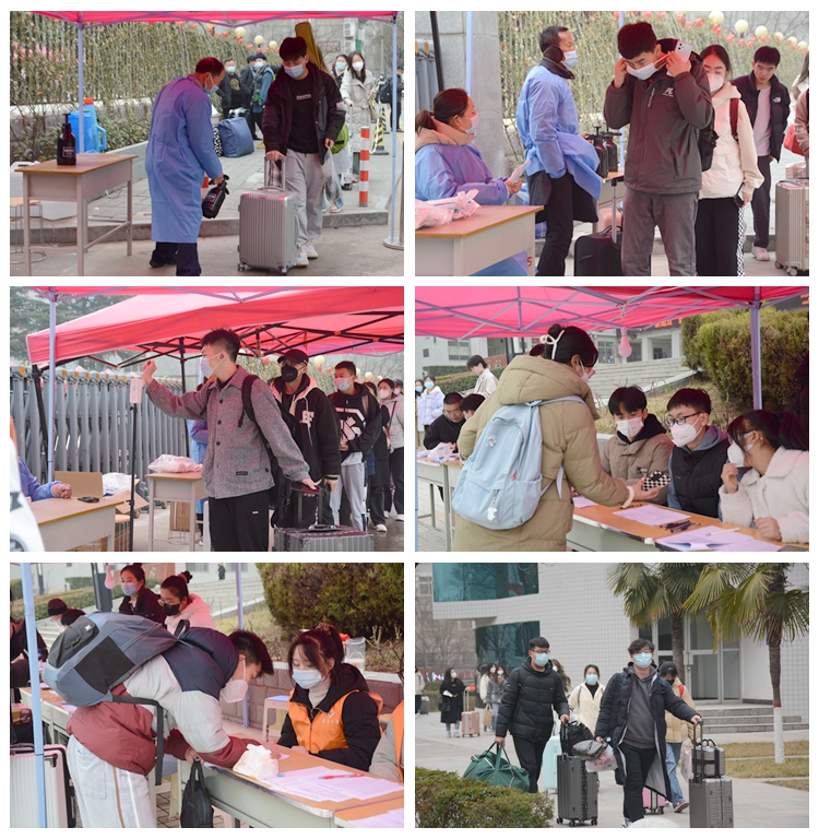 返校期間,各地學生嚴格按照流程,在規定時間內分別從指定校門進入,經過行李消殺、口罩更換、測量體溫,再到所在學院現場辦公處進行登記后返回宿舍。學生處、團委及各二級學院安排志愿者幫助入校學生搬運行李、辦理登記手續,提供暖心服務。