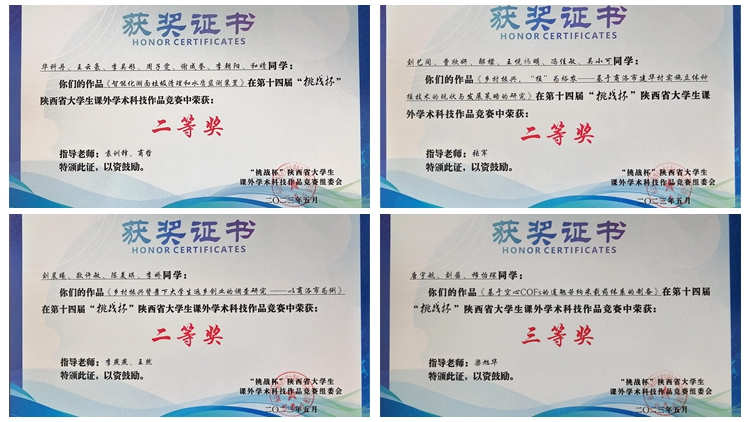 經過省賽初賽和決賽環節的激烈角逐,由電子信息與電氣工程學院教師袁訓鋒和商哲指導、華科丹等同學完成的《智能化湖面垃圾清理和水質監測裝置》,生物醫藥與食品工程學院教師張軍指導、劉藝同等同學完成的《鄉村振興,“植”為裕農——基于商洛市建華村實施立體種植技術的現狀與發展策略的研究》,馬克思主義學院教師李燕燕和王然指導、劉晨曦等同學完成的《鄉村振興背景下大學生返鄉創業的調查研究——以商洛市為例》3個項目均榮獲省級二等獎。由生物醫藥與食品工程學院教師梁旭華指導、唐宇航等同學完成的《基于空心CODs的連翹苷納米載藥體系的制備》榮獲省級三等獎。