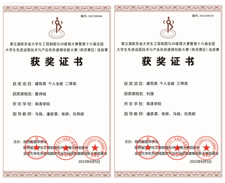6月5日,2023年第五屆陜西省大學生工程制圖與3D建模大賽暨第十六屆全國大學生先進成圖技術與產品信息建模創新大賽(陜西賽區)選拔賽結果揭曉,我校城鄉規劃與建筑工程學院9名學生參賽,5人獲得國賽參與名額,其中2人獲得比賽獎項。雷詩瑤在建筑類(個人全能)中獲二等獎,劉強在建筑類(個人全能)中獲三等獎。