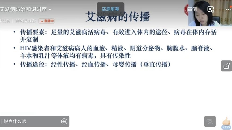 為了提高我校學生對艾滋病的認識,普及艾滋病預防知識,6月24日晚,校醫院以“青春自護,知愛防艾——立即行動,向‘零’艾滋邁進”為主題,通過釘釘直播的方式為在校學生開展專題知識講座。校醫院醫務人員及4000余名學生在線參加講座。