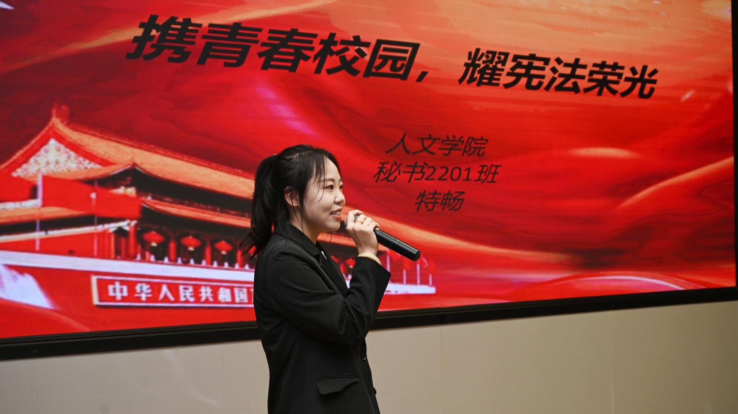 本次比賽自7月份啟動,由二級學院選拔推薦10名學生進入校級決賽。決賽中,選手們圍繞“憲法與國家、憲法與社會、憲法與個人、社會主義法治國家”等主題,從習近平法治思想、憲法法治知識、身邊案例、新聞事件等方面入手,圍繞憲法學習感悟,結合成長經歷,講述憲法故事,表達了努力成長為社會主義法治的忠實崇尚者、自覺遵守者、堅定捍衛者,帶頭做憲法的“代言人”的決心。最終人文學院學生特暢榮獲一等獎,藝術學院學生姜荷、化材學院學生杜晴洋獲二等獎,馬克思主義學院學生李宇航、電信學院學生和婧、經管學院學生劉徹獲三等獎,健康學院學生程怡、建工學院學生劉宇、生物學院學生張鈺晨、數計學院學生雷嘉龍獲優秀獎。