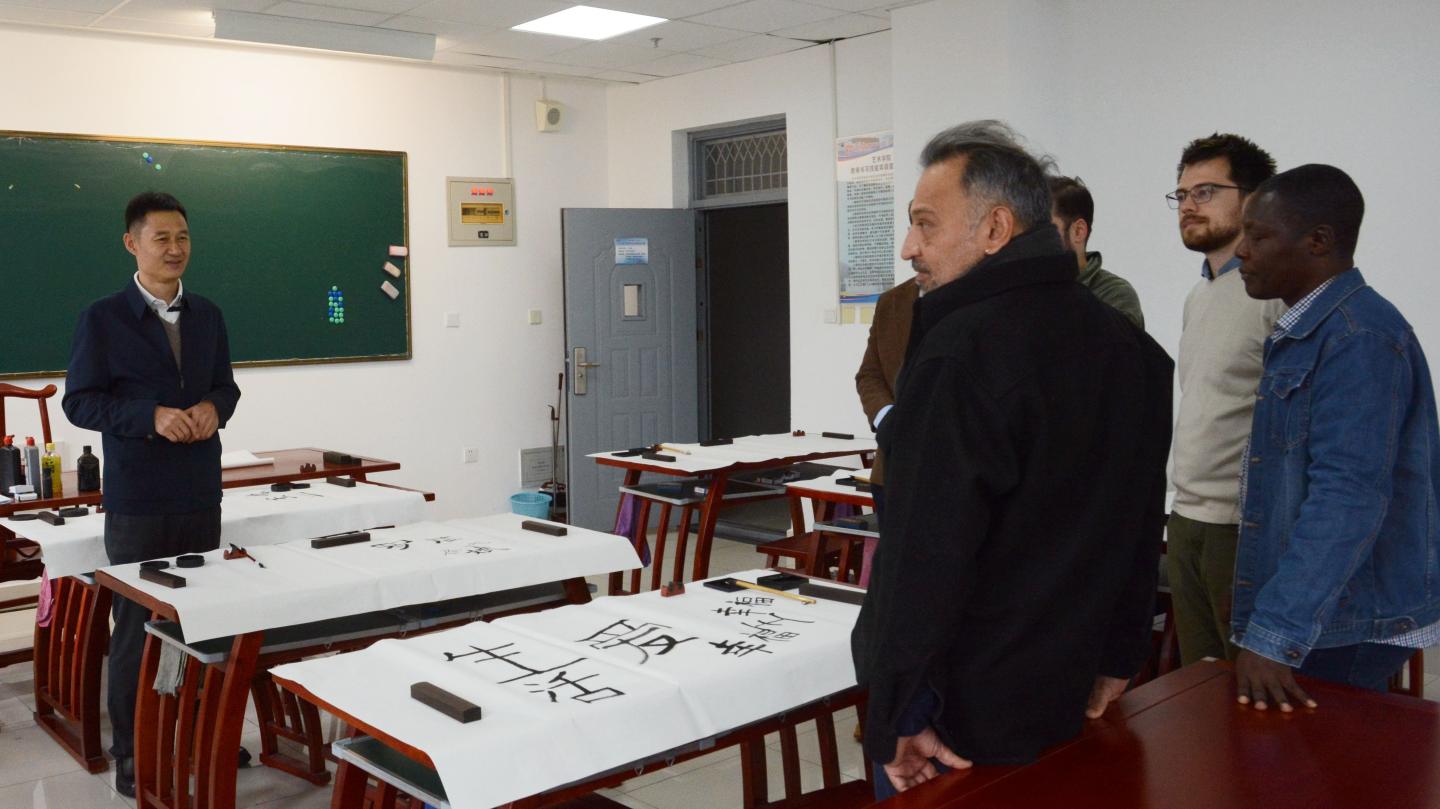 在工作人員的引導(dǎo)下,外籍教師先后參觀了經(jīng)管學(xué)院教室、綜合實驗室、特色計算機實驗室,電信學(xué)院實驗室、人工智能機器人實訓(xùn)室,藝術(shù)學(xué)院智慧書法實驗室、藝術(shù)展廳,商洛文化暨賈平凹研究中心,商洛紅色文化資料館,陜西省尾礦重點實驗室,學(xué)校發(fā)展成就展廳及秦嶺植物標本陳列室。在智慧書法教室,藝術(shù)學(xué)院教師樊洪濤為外籍教師介紹了中國書畫的傳承與發(fā)展歷史,并指導(dǎo)外籍教師進行了書法體驗,“沉浸式”感受了中國傳統(tǒng)文化魅力。