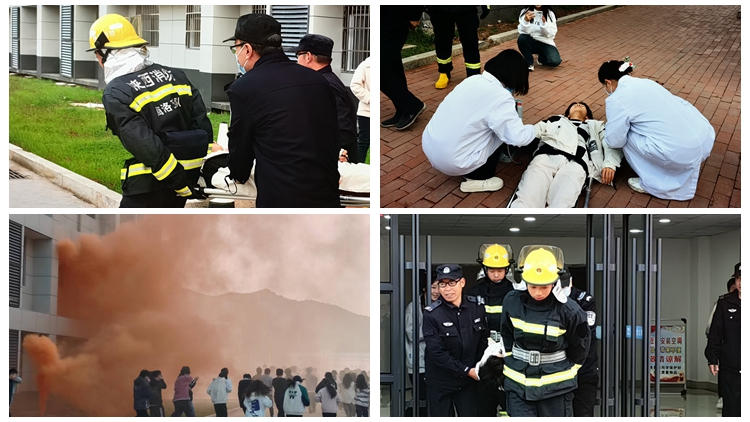 本次演練以丹江校區16C學生公寓樓起火為假設情景,共有火災逃生、火場救援、滅火演示三個環節。隨著火災疏散警報聲響起,“火災現場”頓時濃煙滾滾,疏散演練拉開了序幕,全體學生按照設定的疏散路線,在輔導員、公寓管理員及校警的帶領下,采取掩口鼻、彎腰姿勢從宿舍快速有序地撤離到安全區域。消防員模擬“火場搜救被困學生”,醫護人員立即對“受傷學生”進行模擬救治。消防員啟動消防車在火災現場進行“滅火演示”。整個演練過程逼真、井然有序、達到預期目標。