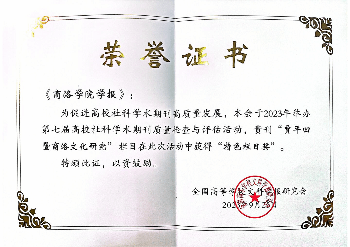 全國高等學校文科學報研究會舉辦的2023年(第七屆)高校社科學術(shù)期刊質(zhì)量檢查與評估活動結(jié)果日前公布,我校學報“賈平凹暨商洛文化研究”欄目獲“全國高校社科期刊特色欄目獎”。這是繼“陜西高校精品社科期刊”和“優(yōu)秀欄目獎”之后,我校學報今年取得的又一佳績。