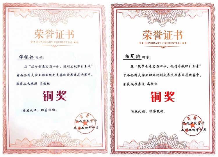 近日,由陜西省教育廳主辦,陜西師范大學和西安電子科技大學承辦的首屆全國大學生職業規劃大賽陜西賽區總決賽結果揭曉。由我校數計學院輔導員趙萍指導的學生楊夏懿、人文學院輔導員李姣指導的學生譚銀鈴分獲成長賽道銅獎。