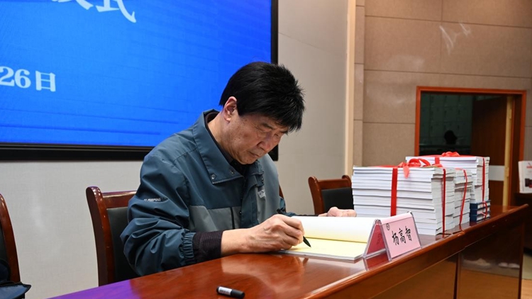 捐贈(zèng)儀式上,王新軍為楊高智頒發(fā)收藏證明,圖書(shū)館館長(zhǎng)張國(guó)春代表學(xué)校接受贈(zèng)書(shū)。