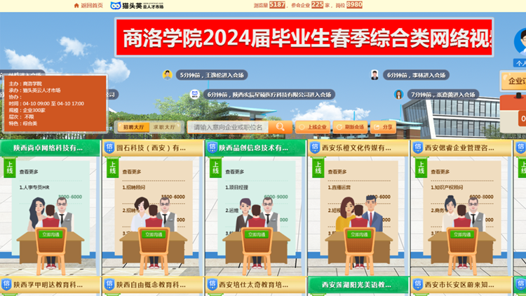 為充分搶抓春季就業(yè)“黃金期”,促進(jìn)畢業(yè)生順利就業(yè)、充分就業(yè)、穩(wěn)定就業(yè),4月10日,2024屆畢業(yè)生春季綜合類(lèi)網(wǎng)絡(luò)視頻招聘會(huì)暨“職引未來(lái)”大中城市聯(lián)合招聘(商洛站)高校畢業(yè)生專(zhuān)場(chǎng)招聘會(huì)在我校順利舉辦。本次招聘會(huì)由省教育廳、省就業(yè)留學(xué)中心指導(dǎo),我校和商洛市人社局主辦,我校就業(yè)中心和商洛市人才中心承辦。