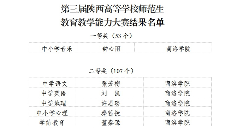 近日,陜西省教育廳公布了第三屆陜西高等學(xué)校師范生教育教學(xué)能力大賽獲獎(jiǎng)名單,我校喜獲一等獎(jiǎng)1項(xiàng),二等獎(jiǎng)5項(xiàng)。