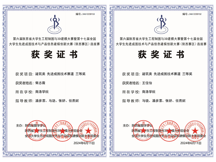 近日,第十七屆全國大學生先進成圖技術與產品信息建模創新大賽(陜西賽區)選拔賽結果揭曉,我校城鄉規劃與建筑工程學院城鄉規劃專業學生常志薇、王佳怡在建筑類(先進成圖技術賽道)中分獲三等獎。