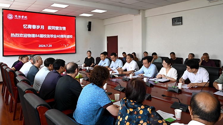 芳華四十載,難忘商院情。7月20日,我校物理84屆校友闊別40載后,從天南海北回母校團聚,重溫師生情誼,共話發(fā)展變遷。副校長王新軍陪同校友參觀校園并代表學(xué)校接受校友捐贈的牌匾。國內(nèi)合作與校友工作處、電信學(xué)院相關(guān)負責(zé)人及教師代表參加活動。座談會由電信學(xué)院黨委書記趙永平主持。