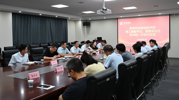 王新軍對彭書旺一行蒞臨學(xué)校表示誠摯歡迎,對商洛經(jīng)開區(qū)批準(zhǔn)建設(shè)以來取得的成績表示祝賀,他指出,商洛經(jīng)開區(qū)立足稟賦優(yōu)勢,創(chuàng)新引才用才政策,謀準(zhǔn)產(chǎn)業(yè)定位,推動企業(yè)提質(zhì)增效,成功通過省級認定,是科技創(chuàng)新驅(qū)動發(fā)展新質(zhì)生產(chǎn)力的重要載體。他簡要介紹了我校辦學(xué)定位、特色與辦學(xué)成果,重點介紹了《商洛學(xué)院服務(wù)商洛高質(zhì)量發(fā)展50條措施》的落實情況及取得成效。他表示,學(xué)校將深刻學(xué)習(xí)領(lǐng)會黨的二十屆三中全會精神,自覺融入和服務(wù)商洛高質(zhì)量發(fā)展大局,持續(xù)深化“三項改革”,深度融入秦創(chuàng)原創(chuàng)新驅(qū)動平臺,憑借創(chuàng)新政策和優(yōu)質(zhì)平臺推進科技成果轉(zhuǎn)化。希望雙方以此次合作交流為契機,推動產(chǎn)學(xué)研用深度融合,提升科研成果轉(zhuǎn)化實效,搭建“人才共享、資源共用、科研共建”的溝通交流平臺,共同推進區(qū)域高質(zhì)量發(fā)展。
