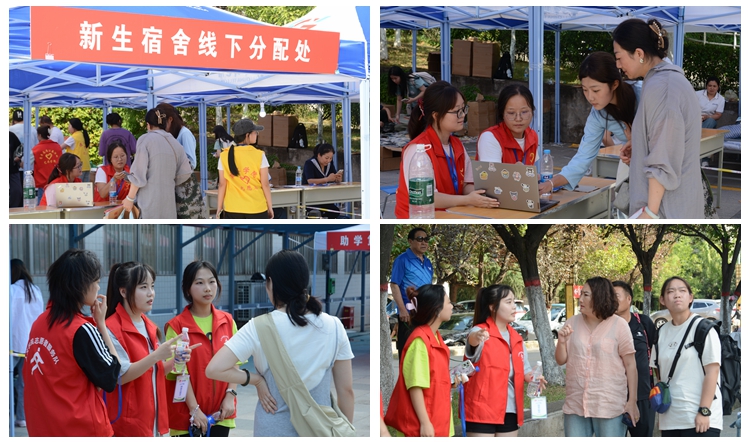 為方便新生入學(xué),學(xué)校在各個(gè)站點(diǎn)設(shè)立了報(bào)到接站處,并在周邊路口安置指引路標(biāo)。在校園內(nèi),醒目的迎新標(biāo)語(yǔ)、熱情的志愿者隨處可見(jiàn),學(xué)校還設(shè)立了臨時(shí)醫(yī)療服務(wù)區(qū),為新生、家長(zhǎng)及工作人員提供及時(shí)的醫(yī)療保障。在各緊要路口設(shè)立志愿服務(wù)區(qū),為新生和家長(zhǎng)提供校園指引和飲用水等服務(wù)。在新生報(bào)名處和玉蘭廣場(chǎng)設(shè)立的資格審查、助學(xué)貸款回執(zhí)辦理、學(xué)費(fèi)繳納等接待平臺(tái)前,新生正有序排隊(duì)辦理各項(xiàng)手續(xù),秩序井然。