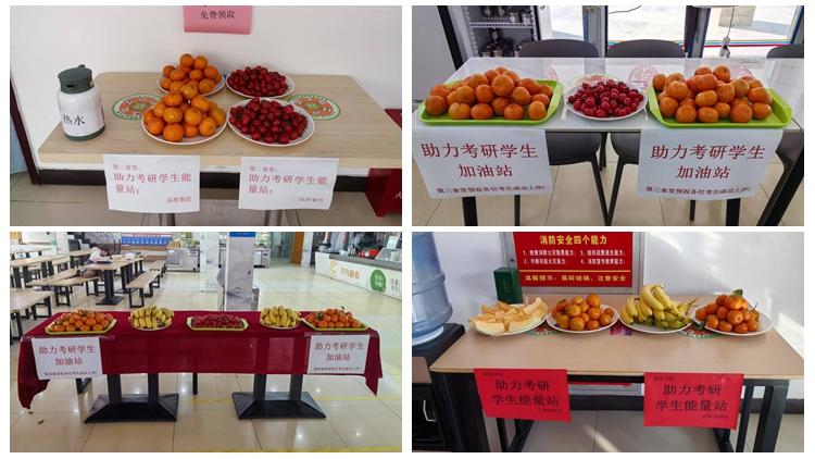 各學生食堂設立“考研加油站”,為考研學生免費提供各類水果,冬至當天,教工食堂為研究生招生考試考務人員及工作人員提供了手工水餃。