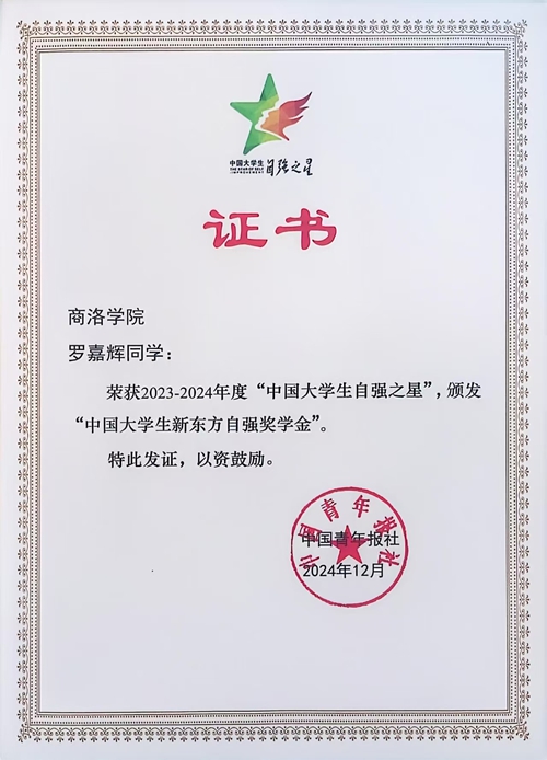 羅嘉輝曾擔任團省委公益宣傳員、商洛市天健為老服務志愿者協會學生部負責人、商洛學院青年志愿者協會項目拓展部副部長,累計參與志愿服務時長230余小時,組織參與的多個志愿服務項目被商州區人民政府網、商洛日報等媒體報道。先后獲得國家勵志獎學金、學校優秀志愿者、文明大學生、優秀團學干部、優秀組織者等多項榮譽。順利考取BIM一級建模師等職業資格證書,多次參加國家級專業技能大賽并獲獎。此次獲得“中國大學生自強之星”獎學金,是對他優良素質的全面肯定。