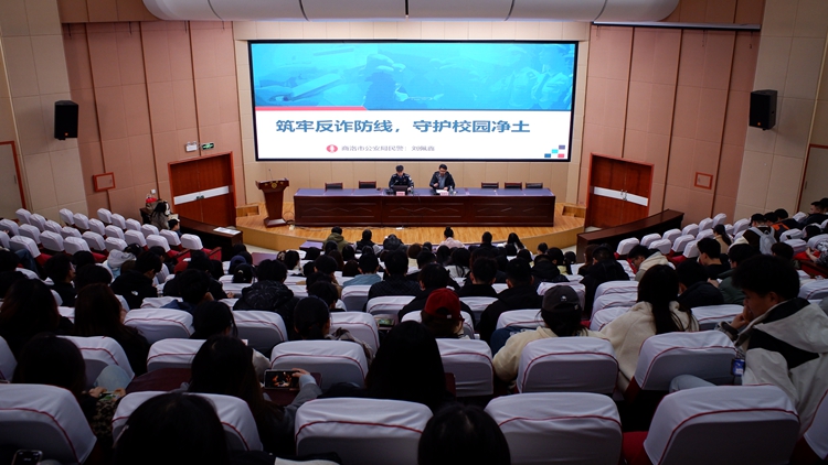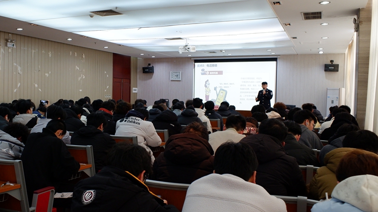 為全面提升師生防范電信網絡詐騙的意識與能力,維護校園安全穩定,3月7日下午,學校邀請商洛市公安局四級警長劉佩鑫,在北新街校區和丹江校區連作兩場防范電信詐騙專題報告會。校黨委委員、宣傳部部長王霄飛,電信學院黨委書記袁訓鋒分別主持兩校區報告會。各二級學院輔導員及學生代表500余人參加報告會。