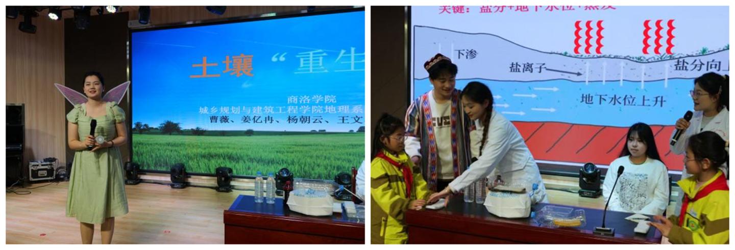 3月26日下午,在商洛市小學和商州區第六小學,房舒博士帶領由曹薇、姜億冉、楊朝云、王文睿、高慶欣等地理科學專業學生組成的“土壤奇妙旅團”,開展了《土壤重生記》科普情景劇活動。活動以新疆農民買買提改良鹽堿地的案例為背景,通過情景劇的形式生動展現了土壤科學家如何幫助農民改善土地質量。團隊設計了物理方法、化學方法和生物方法三種土壤改良技術的實驗演示,讓學生們直觀了解土壤改良的科學原理?;顒舆^程中,團隊成員與小學生積極互動,通過問答和實驗操作,深入淺出地講解了土壤保護的重要性。這種“實驗+話劇”的創新教學模式,有效激發了學生們對地理科學的興趣。