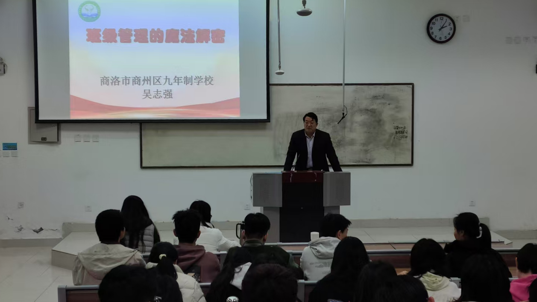 為提升地理科學專業師范生班級管理能力,不斷優化“大學-政府-基礎教育學校”合作機制,3月27日,陜西省優秀班主任、商州區九年制學校副校長吳志強走進課堂,為地理專業學生做了題為《班級管理的魔法解密》的專題報告。