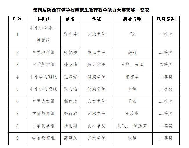 近日,陜西省教育廳公布了第四屆陜西高等學校師范生教育教學能力大賽獲獎名單。我校獲得一等獎1項、二等獎8項,獲獎數量再創(chuàng)新高。