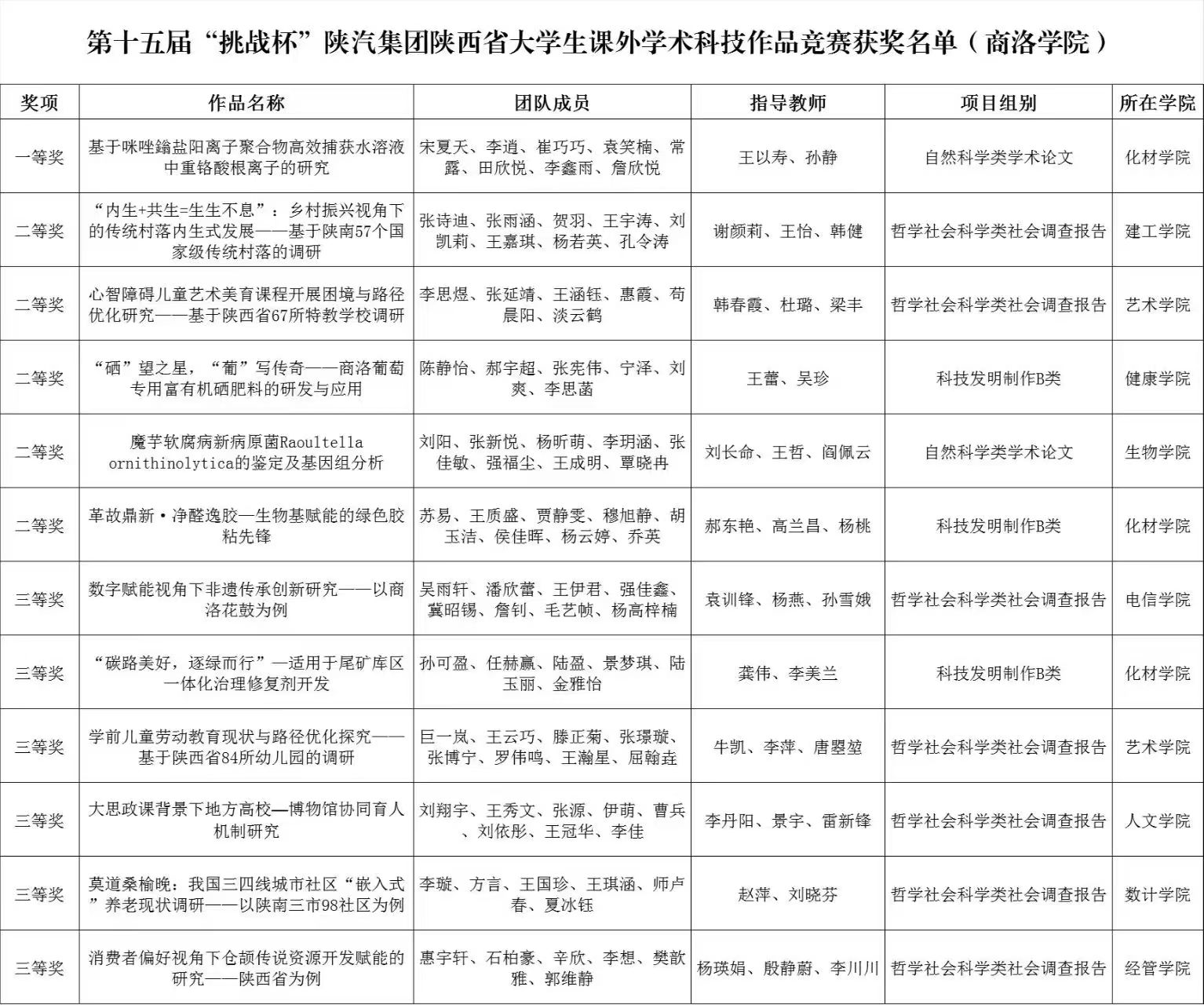 5月24日,第十五屆“挑戰杯”陜西省大學生課外學術科技作品競賽圓滿落幕。我校推薦參與省賽的13件作品中有12件獲獎,其中一等獎1項、二等獎5項、三等獎6項,獲獎項目總數取得新的突破。
