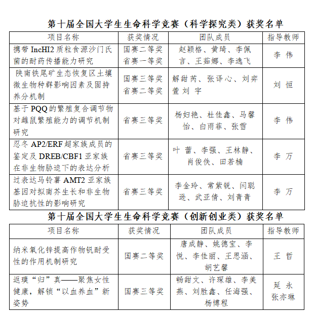 近日,第十屆全國大學生生命科學競賽科學探究類和創新創業類全國總決賽分別落幕。我校學生在本屆競賽中表現出色,榮獲第十屆全國大學生生命科學競賽科學探究類全國總決賽二等獎1項、三等獎1項,陜西省賽區一等獎1項、二等獎1項、三等獎3項,榮獲創新創業類全國總決賽二等獎和三等獎各1項。